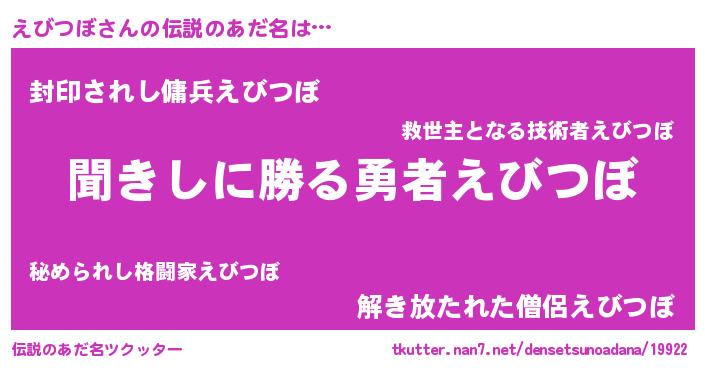 | 意味不明あだ名 | 『自称えびつぼ』『永久保存えびつぼ』 |