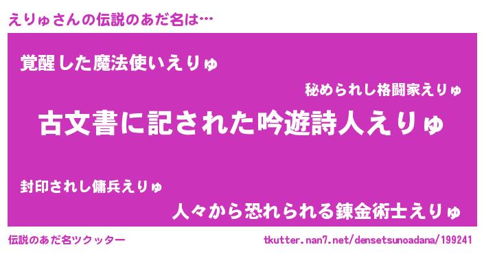 | 意味不明あだ名 | 『自称えりゅ』『たけのこ科えりゅ属』 |