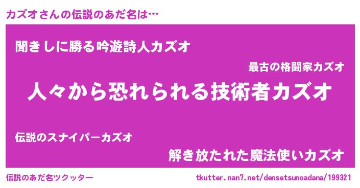 | 男性向けラノベタイトル風あだ名 | 『おまえをオタクにしてやるから、俺をカズオにしてくれ! 』 |