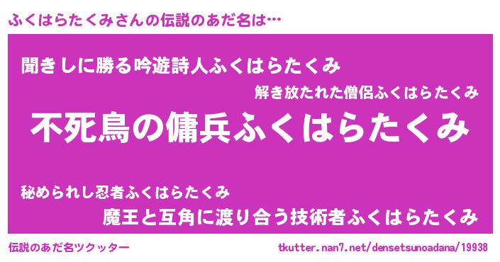 | 男性向けラノベタイトル風あだ名 | 『魔弾の王とふくはらたくみ』 |