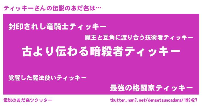 | 意味不明あだ名 | 『自称ティッキー』『永久保存ティッキー』 |
