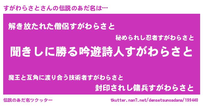 | 女子向けラノベタイトル風あだ名 | 『異世界で失敗しない100のすがわらさと』 |