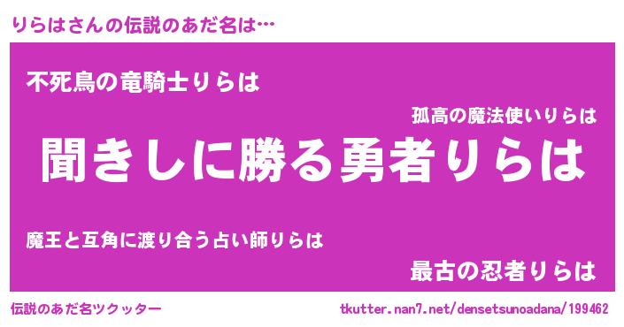 | 男性向けラノベタイトル風あだ名 | 『りらはという概念が存在しない退屈な世界 』 |