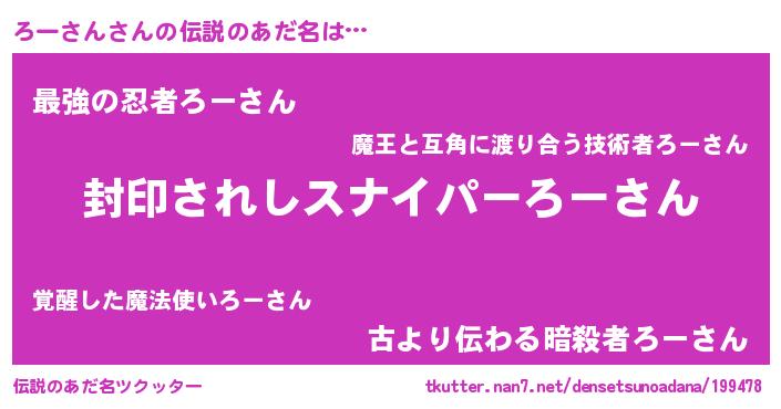 | 男性向けラノベタイトル風あだ名 | 『ろーさんに滅ぼされるだけの簡単なお仕事です』 |