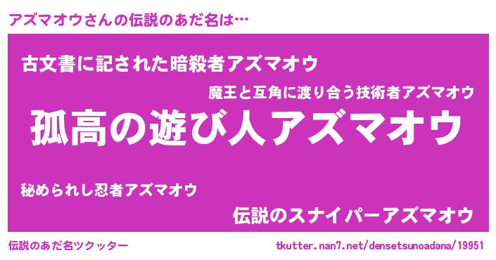 | 男性向けラノベタイトル風あだ名 | 『魔弾の王とアズマオウ』 |