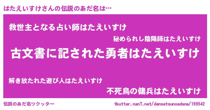 | 男性向けラノベタイトル風あだ名 | 『はたえいすけ~年齢イコール彼女いない歴の魔法使い~』 |