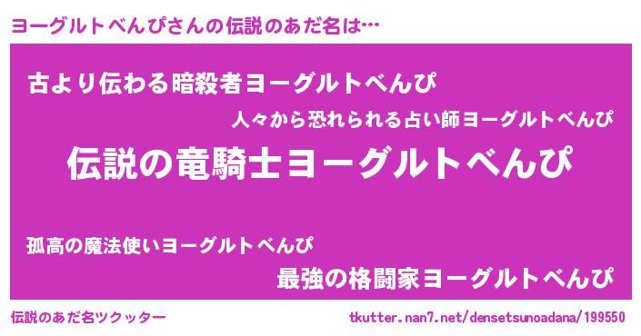 | 男性向けラノベタイトル風あだ名 | 『緋弾のヨーグルトベンピ』 |