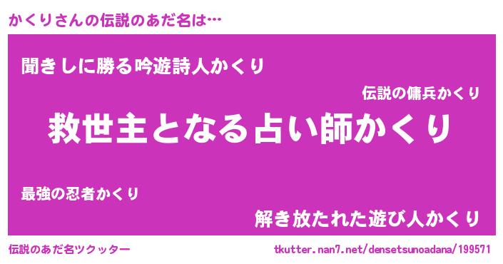 | ヒーロー風カッコイイあだ名 | 『慈愛の使者かくり』『ネオカクリ』 |
