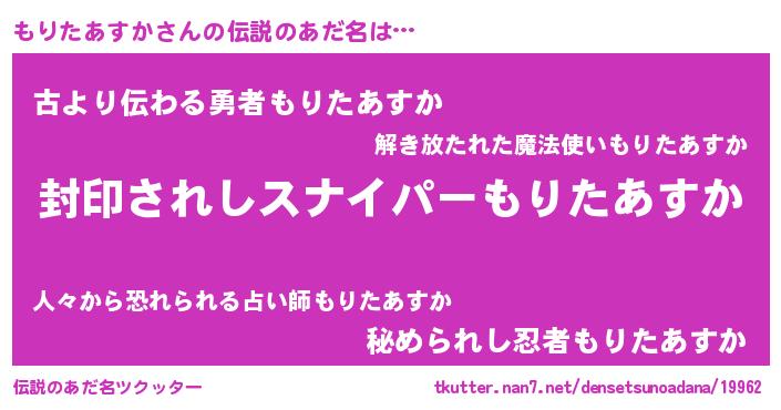 | 胡散臭い通販商品みたいなあだ名 | 『億万長者になれる霊験あらたかなお札…その名も「もりたあすか」』 |