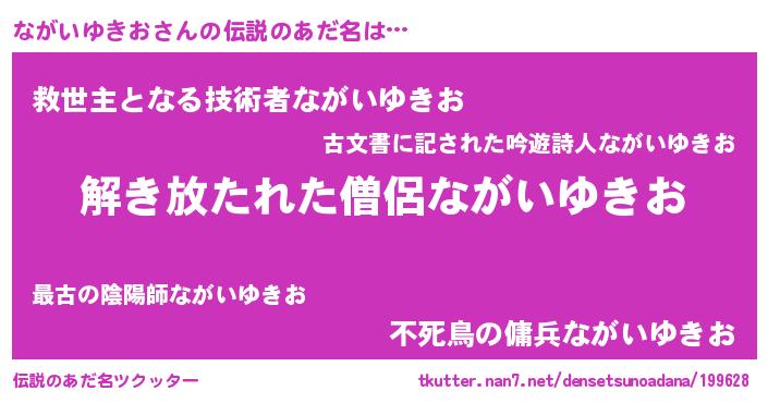 | 男性向けラノベタイトル風あだ名 | 『ながいゆきおの嫁は女の子じゃないと思った?』 |