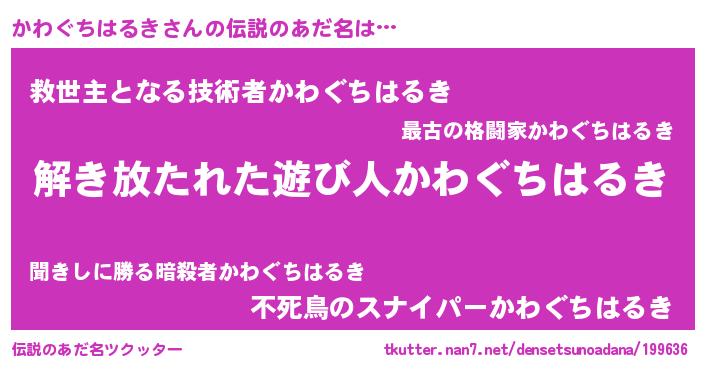 | 肩書あだ名 | 『かわぐちはるきリーダー』 |