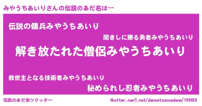 | ポケモン風あだ名 | 『ヒミヤウチアイリ』『ミヤチュウ』 |