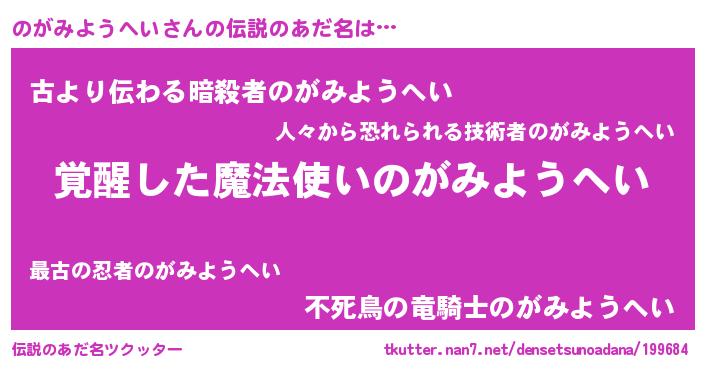 | 男性向けラノベタイトル風あだ名 | 『この素晴らしい世界にのがみようへいを!』 |