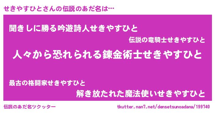 | ヘコむあだ名 | 『せきやすひと(苦笑)』『せき太郎』 |
