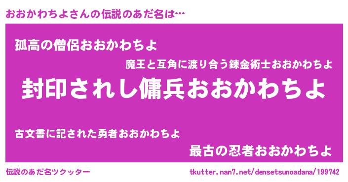 | ヒーロー風カッコイイあだ名 | 『究極戦士オオカワチヨ』『仮面オオダー』 |