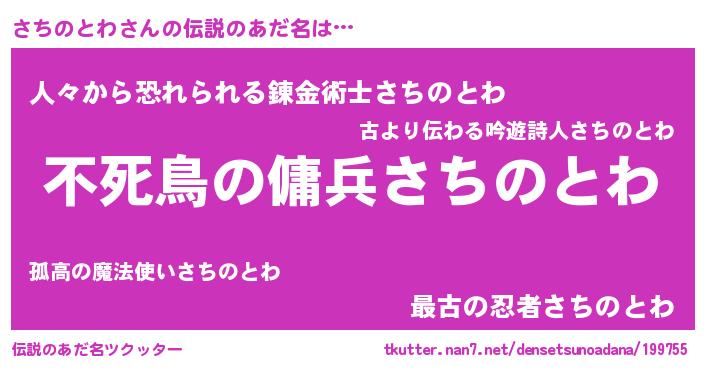 | 男性向けラノベタイトル風あだ名 | 『Re:さちのとわから始める異世界生活』 |