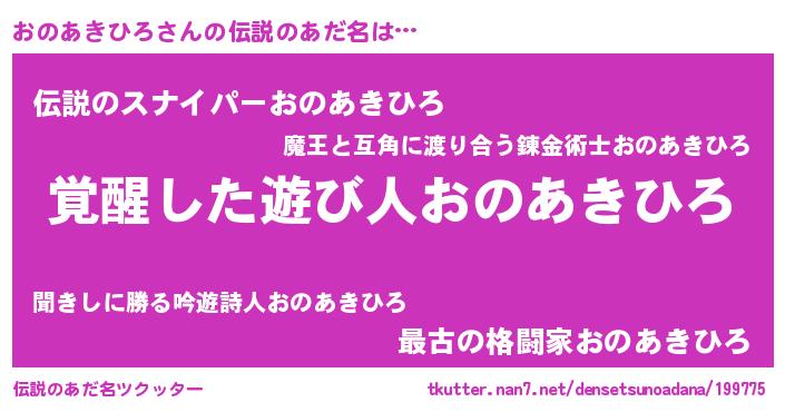 | 男性向けラノベタイトル風あだ名 | 『おのあきひろの嫁は女の子じゃないと思った?』 |