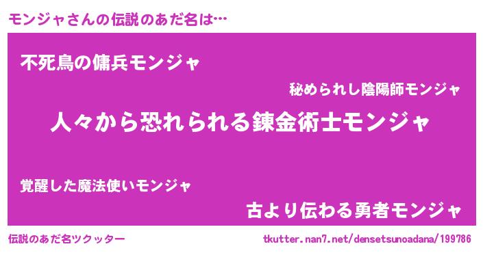 | 男性向けラノベタイトル風あだ名 | 『魔弾の王とモンジャ』 |