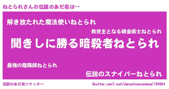 | 意味不明あだ名 | 『永久保存ねとられ』『自称ねとられ』 |