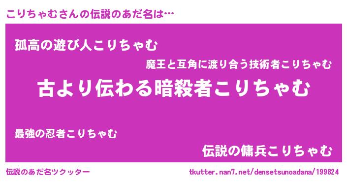 | 男性向けラノベタイトル風あだ名 | 『魔弾の王とこりちゃむ』 |