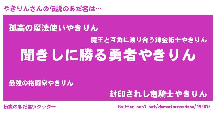 | 意味不明あだ名 | 『住所不定無職やきりん(98歳)』 |