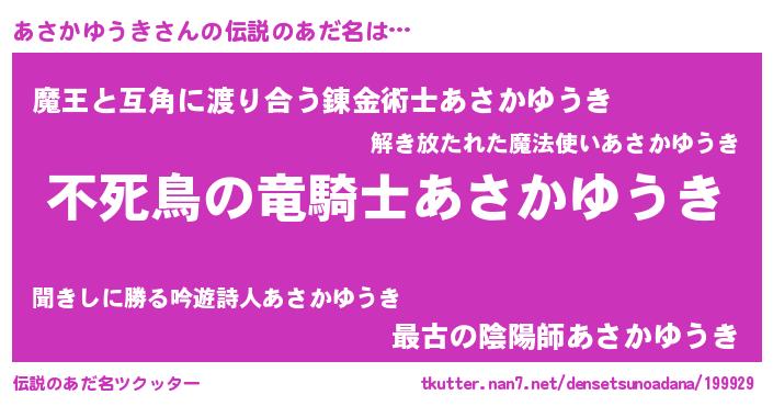 | ヒーロー風カッコイイあだ名 | 『スーパーアサカユウキ』『仮面アサダー』 |