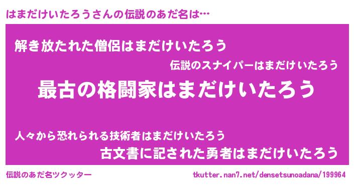 | 意味不明あだ名 | 『住所不定無職はまだけいたろう(10歳)』 |