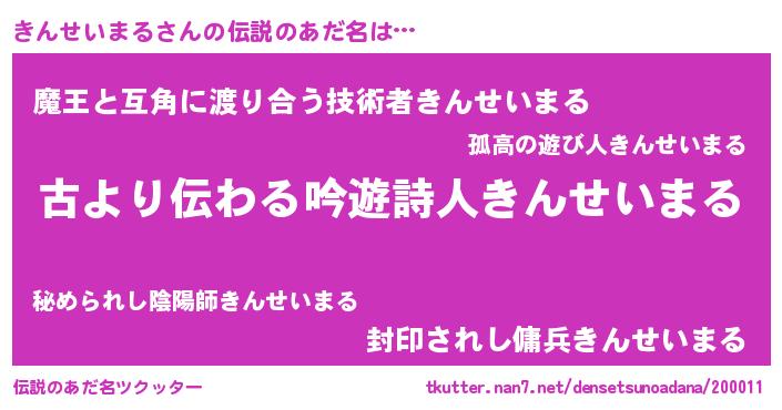| ヒーロー風カッコイイあだ名 | 『ネオキンセイマル』『魔戒騎士キン』 |