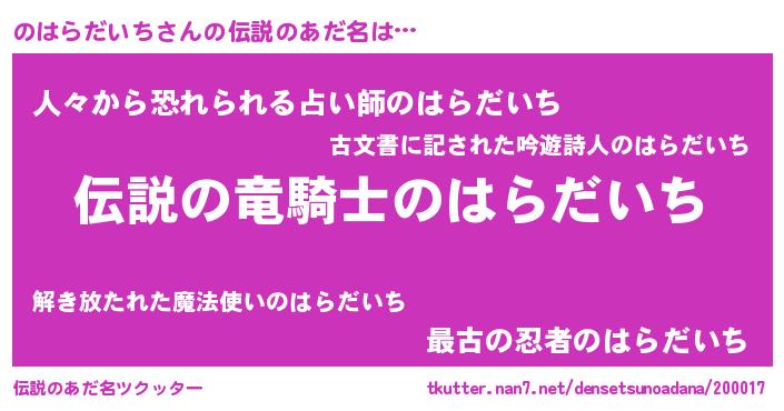 | 女子向けラノベタイトル風あだ名 | 『(仮)のはらだいちのやんごとなき事情』 |