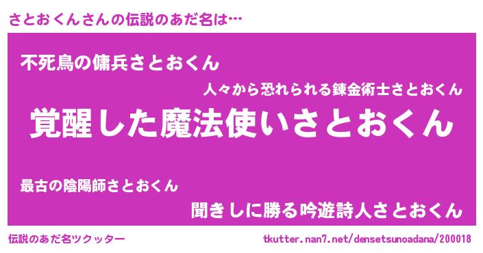 | 男性向けラノベタイトル風あだ名 | 『この素晴らしい世界にさとおくんを!』 |