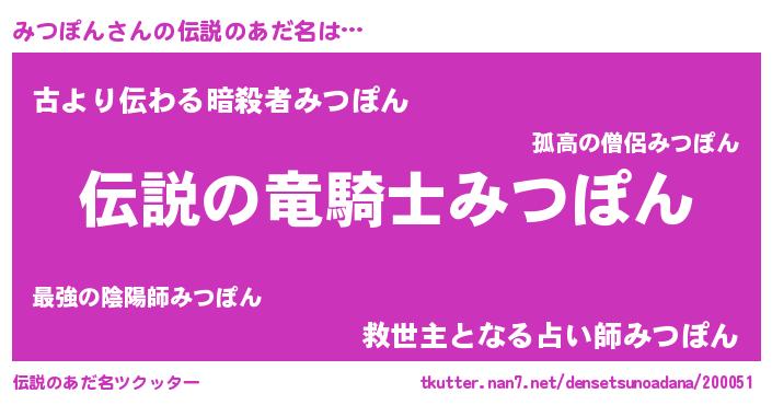 | 男性向けラノベタイトル風あだ名 | 『魔弾の王とみつぽん』 |