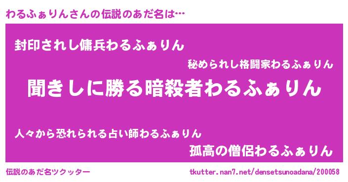 | 男性向けラノベタイトル風あだ名 | 『わるふぁりんという概念が存在しない退屈な世界 』 |