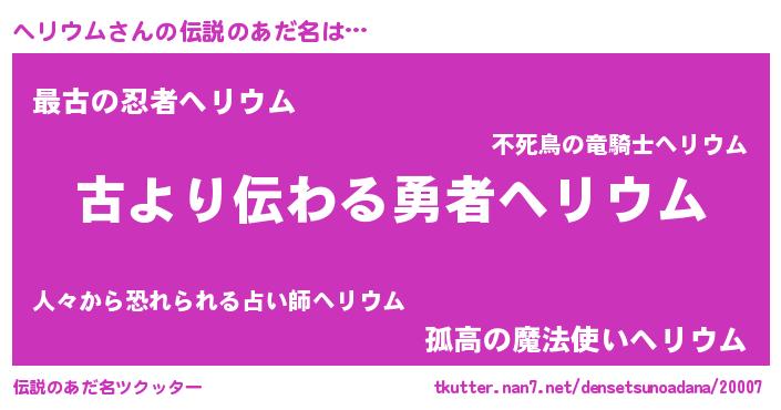 | ヒーロー風カッコイイあだ名 | 『ネオヘリウム』『ウルトラヘリウムマン』 |