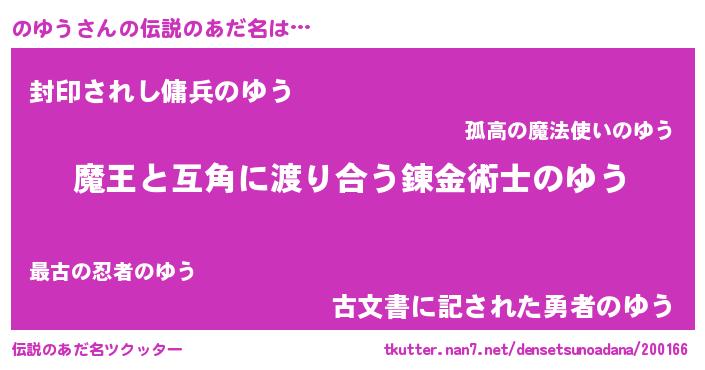 | 男性向けラノベタイトル風あだ名 | 『おまえをオタクにしてやるから、俺をのゆうにしてくれ! 』 |