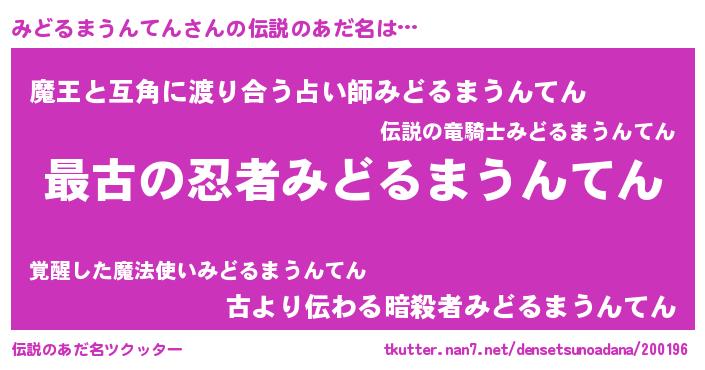 | 男性向けラノベタイトル風あだ名 | 『うちの娘の為ならば、俺はもしかしたらみどるまうんてんも倒せるかもしれない。』 |