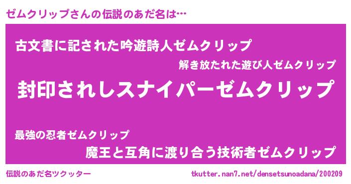 | ヒーロー風カッコイイあだ名 | 『スーパーゼムクリップ』『仮面ゼムダー』 |