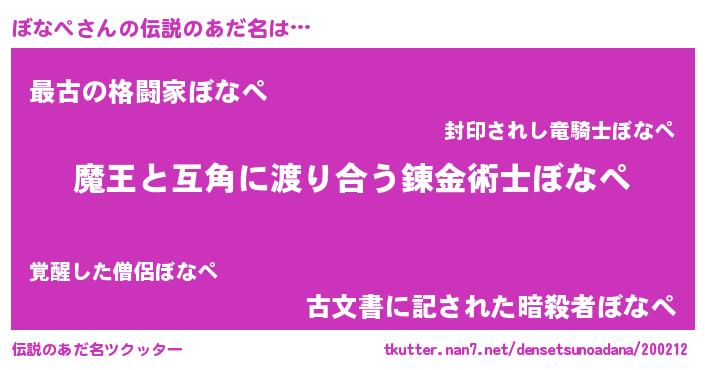 | ヒーロー風カッコイイあだ名 | 『仮面ボナダー』『正義の使者ぼなぺ』 |