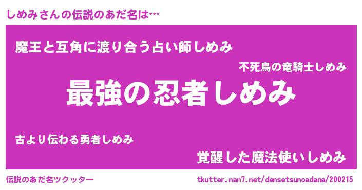 | ヒーロー風カッコイイあだ名 | 『ウルトラしめみマン』『究極戦士シメミ』 |
