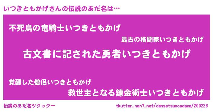 | 胡散臭い通販商品みたいなあだ名 | 『前代未聞の水素水…その名も「いつきともかげ」』 |