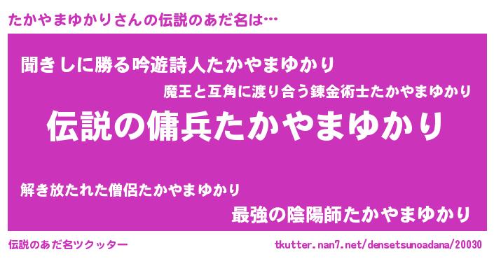 | ヒーロー風カッコイイあだ名 | 『仮面タカダー』『ネオタカヤマユカリ』 |