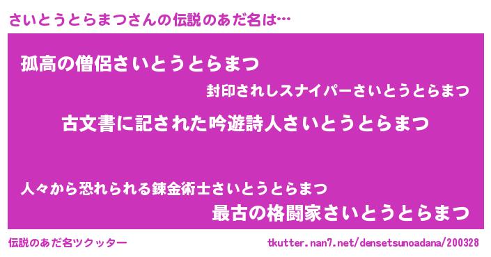 | ヘコむあだ名 | 『さいとうとらまつ(小並感)』『さいっ子』 |