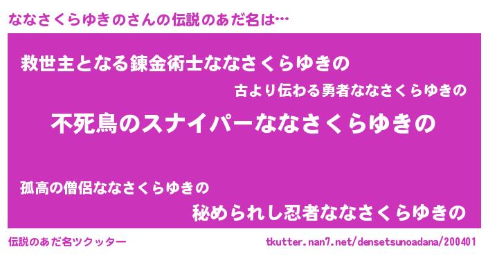 | 男性向けラノベタイトル風あだ名 | 『転生したらななさくらゆきのだった件』 |
