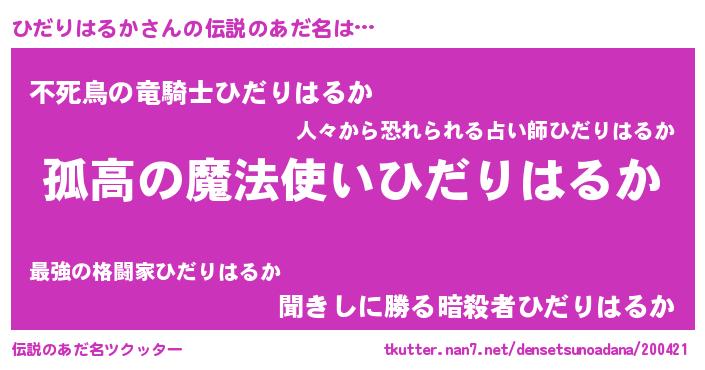 ポケモン風あだ名 | 『ヒヒダリハルカ』『ヒダセウス』 |