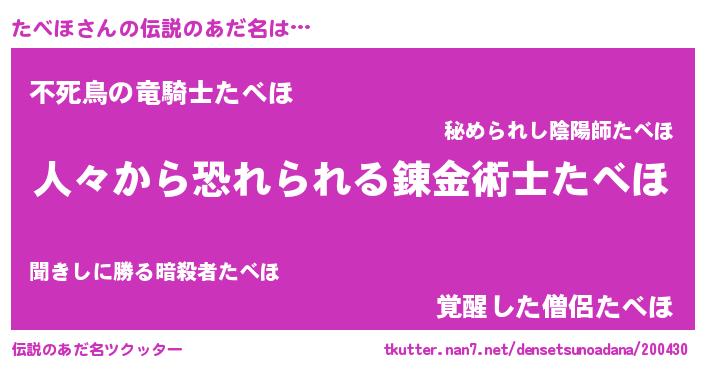 | 男性向けラノベタイトル風あだ名 | 『タベホスレイヤー』『たべほの憂鬱』 |