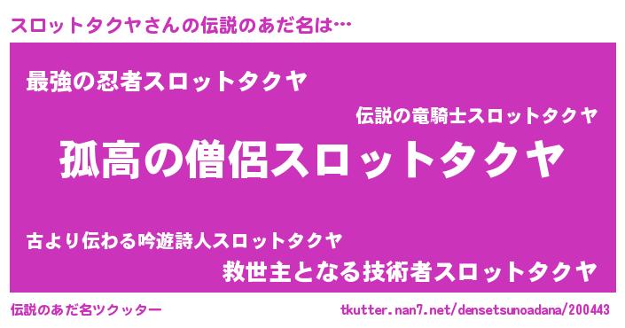 | 胡散臭い通販商品みたいなあだ名 | 『信頼と実績のネックレス…その名も「スロットタクヤ」』 |