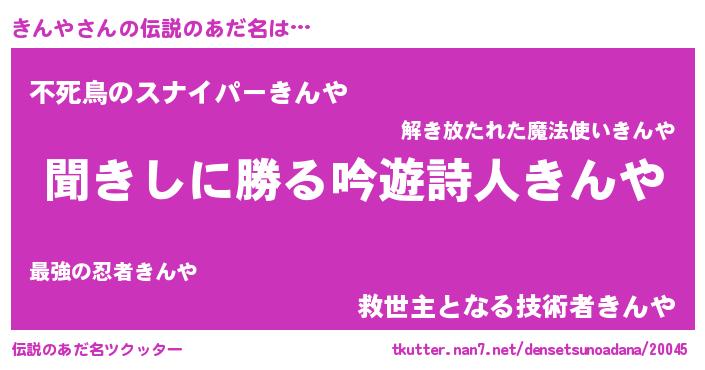| 男性向けラノベタイトル風あだ名 | 『きんやという概念が存在しない退屈な世界 』 |
