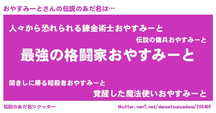 | 男性向けラノベタイトル風あだ名 | 『この素晴らしい世界におやすみーとを!』 |