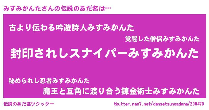 | 胡散臭い通販商品みたいなあだ名 | 『あなたにだけ特別に提供する世界で10本だけ現存している希少なブランデー…その名も「みすみかんた」』 |