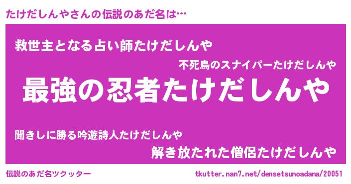 | 男性向けラノベタイトル風あだ名 | 『うちのたけだしんやが世界を掌握している!』 |