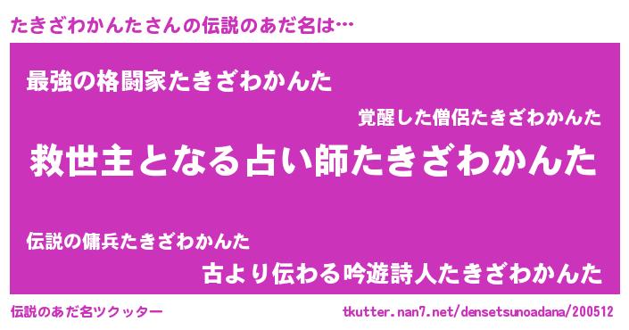 | 男性向けラノベタイトル風あだ名 | 『たきざわかんた~年齢イコール彼女いない歴の魔法使い~』 |